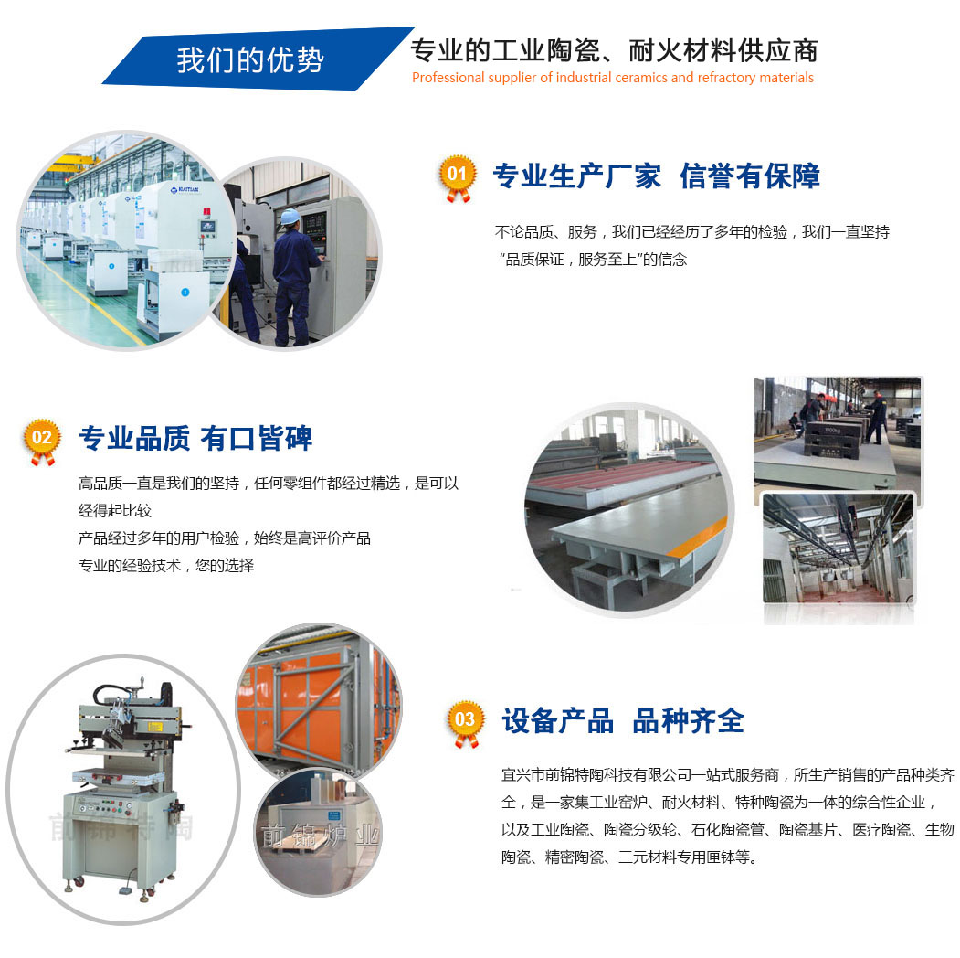 宜興市前錦特陶有限公司作為成員企業(yè)之一,公司主要生產(chǎn)工業(yè)陶瓷、窯具、匣缽、窯爐內(nèi)襯系列。工業(yè)陶瓷以生產(chǎn)氧化鋯陶瓷、氧化鋁陶瓷、碳化硅陶瓷、氮化硅陶瓷等先進(jìn)陶瓷為主;碳化硅制品有碳化硅異形件、三明治板、爐管等系列;耐火高溫窯具為剛玉爐管、剛玉莫來石制品、剛玉推板等產(chǎn)品;以及燒結(jié)墊板、氧化鋁空心球制品、sic板、石墨坩堝、堇青石復(fù)合莫來石板移進(jìn)板、鋯粉、氮化硅陶瓷環(huán)、陶瓷棒、石化陶瓷管、陶瓷基片、磨介、分級(jí)輪和氮化硅球閥、熱電偶保護(hù)管、升液管等...